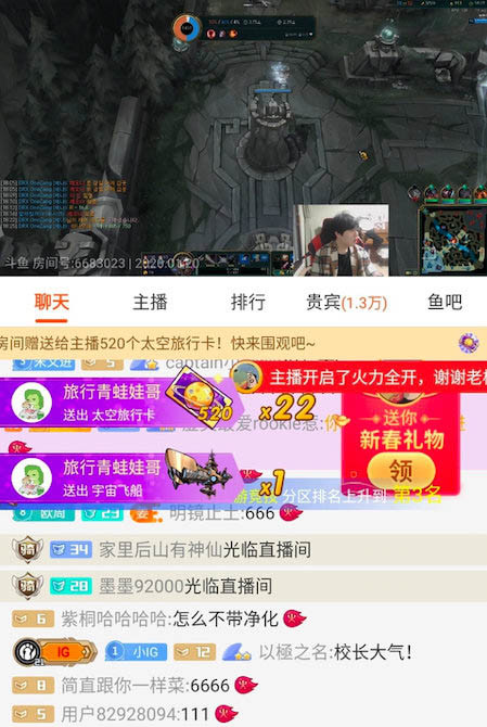 王校长本年的状况我们都十分的了解,最近也是解除了约束,前段时间传出在日本吃高档照料。2020年1月20号晚上九点,王校长出现在rookie直播间狂刷22万。可见校长对有rookie的十分喜爱。还记得4月2日rookie入驻斗鱼直播间。当日rookie首秀,王思聪当即给刷了90万礼物为rookie接风,其他队友只刷了几万罢了。也再度证明有潜力的他的所作所为都被校长时间重视着,实际上Rookie为IG队宠在很早之前,IG副总裁藏马就表明王校长爱Rookie是真的。