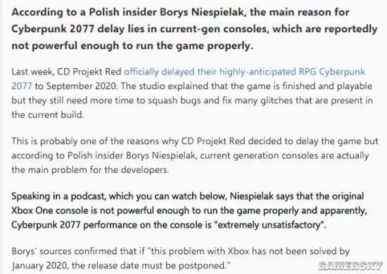 依据外媒Altchar的总结(节目原为波兰语),波兰爆料人Borys Niespielak在节目中发表,原版Xbox One主机的技术不行强壮,无法正常运转《赛博朋克2077》。这款游戏在Xbox One主机上的体现“极端令人不满”。