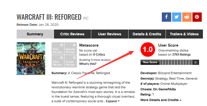 由于星际1重制的不火先例,作为重度魔兽粉,小编关于《魔兽争霸3重制版》一向充溢忧虑。不过没想到的是,新版于1月29日正式上线之后,比各种料想的成果都要更差,画质缩水、bug成堆、偷工减料,乃至暴雪各种迷之操作(强升BN版别、新版地图产权声明),都让人不能满足。随同而来,是各方论坛的炸锅与海量的退款请求,现在在国外闻名的评分渠道metacritic上,重制版的评分已跌至1.0分(10分制),创暴雪游戏前史最低。