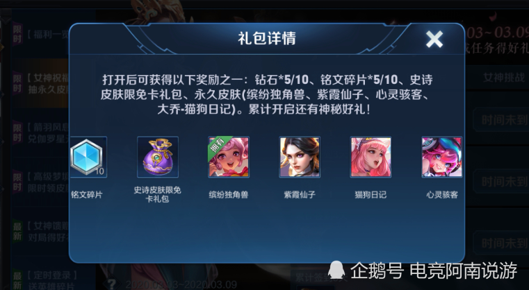 最近,王者荣耀给玩家带来了许多的福利,就拿今日刚上线的“女神祝愿”活动来说吧,只需玩家登录游戏,即可领取到一个礼包,翻开后不只有很多的钻石,铭文碎片,更有永久史诗皮肤免费拿,所以玩家们必定不要错失这个活动了。