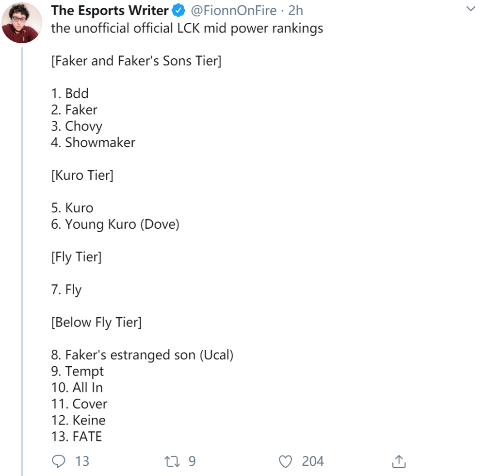 LCK榜首轮的竞赛行将完毕,ESPN记者在推特上发布了一份非官方LCK中单战力排名。13名中单被分为四个等级:李总及总裁少爷级、Kuro级、Fly级、比Fly更差级。