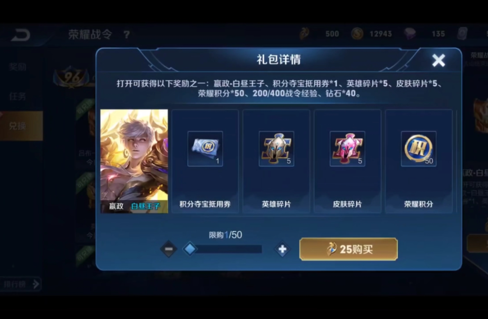 这个嬴政返场皮肤宝箱里边能够抽到战令限制皮肤嬴政白天王子、积分夺宝抵用券、英豪碎片*5,皮肤碎片*5,、荣耀积分50、200/400战令经历、钻石*40.这么贵重的东西,肯定不能一下悉数敞开,不然心脏受不了,那么就采纳所谓的形而上学吧,先开三个试试水,取得600战令经历,5个英豪碎片。