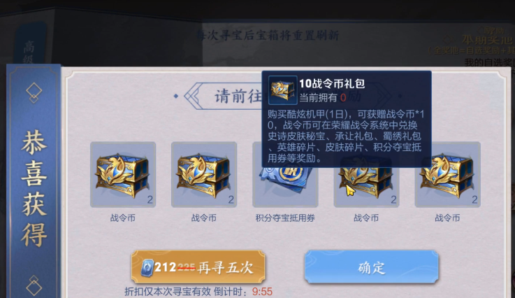 就在最近,王者荣耀也是新上线了一个福利活动,玩家们只需要花费50点券,就有时机获取性价比十分高的传说皮肤,而这个活动便是咱们所说的峡谷寻宝。这个活动跟那些直售抽奖宝箱不一样的是,它五连抽还有优惠,而且还能够自选皮肤,而不是随机的,所以许多玩家都很愿意参与这个活动。