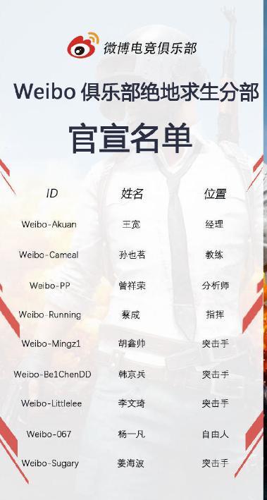 绝地求生在完毕了各大联赛之后,行将迎来PCL的重头戏PCL春季赛,各大战队也纷繁开端严重备战傍边,PCLP春季赛也是在昨日首先开战抢夺7个PCL正赛名额,PCL战队将迎来新势力的应战,等待新势力战队带给咱们不相同的赛事体会,而在昨日Weibo战队也是发布了PCL的选手名单
