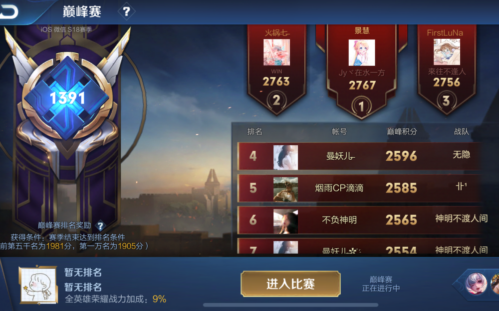 S18赛季的大神十分多,比方说韩涵。在赛季中期的时分,韩涵早年完结过霸榜,一人包办巅峰赛的前三名,但韩涵早年三掉下来后,状况也是一泻千里,直到赛季末也没能重回前三。