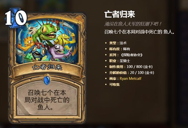 莫戈尔·莫戈尔格,圣骑士传说侍从,221,圣盾 亡语:将“终极莫戈尔格”洗入你的牌库。终极莫戈尔格,863鱼人,圣盾,战吼:随机呼唤4个鱼人,使它们取得圣盾。这便是圣骑士的终极侍从牌,连圣骑士的终极牌都是鱼人了,还不现已说明晰新版别鱼人骑才是主角吗?想想之前都是要靠鱼人为王或许亡者归来才干铺场,现在有了终极莫戈尔格便是说能在额外铺一次场而且还带着圣盾。尽管鱼人身段都不好,但有了圣盾的鱼人足以在场上苟活下来。后续BUFF加上岂不是要起飞,圣盾破了再加上个鳞甲领主,又是一波圣盾鱼。