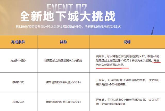 其他要想取得+12传说兵器的变成永久的晋级卷,就得完结晋级大应战的使命,即刷多个新图,当然也能够96级就开端做!意思说能够一边做晋级大应战,收取+12(60天)传说兵器变永久兑换卷,一同一边晋级到100级,收取60天+12传说兵器一个!