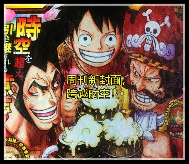 首要,是本次集英社的周刊封面,宣传语是【逾越时空传承的毅力】,封面中路飞是咖位,而左右两头,分别是光月御田和罗杰。尾田刻画的这三人本就差不多的性情,这下好了,聚在一起那就来个干杯吧!