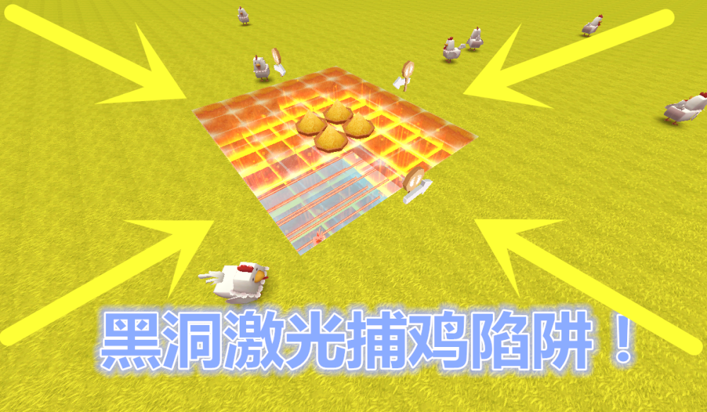 这样一个黑洞激光捕鸡圈套就制造结束了,大神也是呼唤出了许多的小鸡测验圈套,当小鸡看到鸡饲料后就会被瞬间吸入圈套内,接着变成香馥馥的大鸡腿,喜爱捕猎的小伙伴快去试试吧。